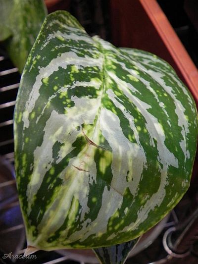 This hybrid has been made in 1998 at the Sunshine Foliage World.The ovule parent is Aglaonema 'Manila Pride', the pollen parent is Aglaonema nitidum fo. curtisii 'Mona Lisa'.