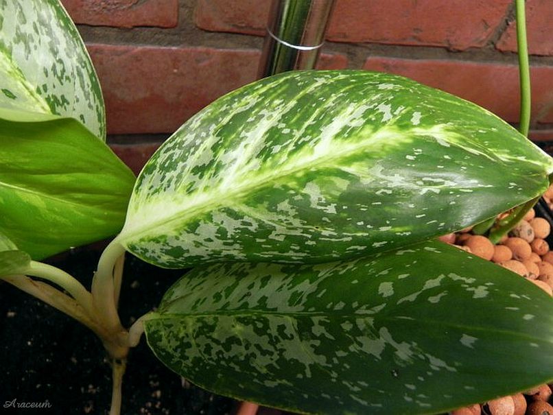 The ovule parent is Aglaonema 'Manila Pride', the pollen parent is Aglaonema nitidum fo. curtisii 'Mona Lisa'.