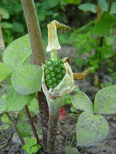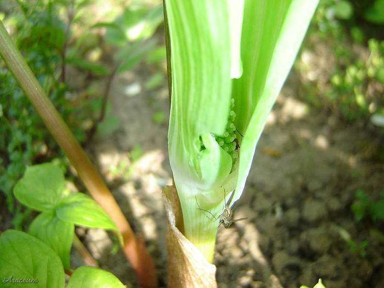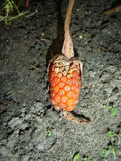 The upper part of the inflorescence. The spathe has a very short apex. | This one had only male flowers. |