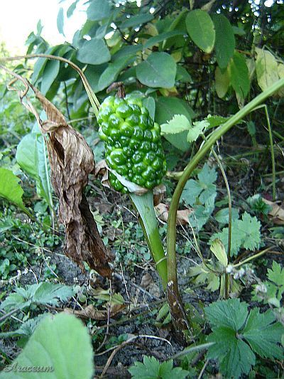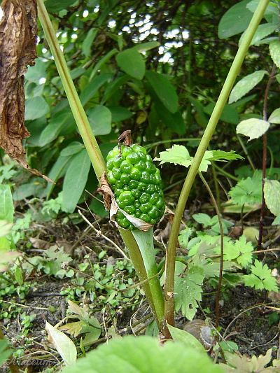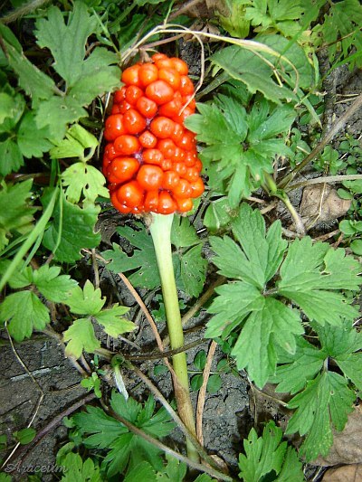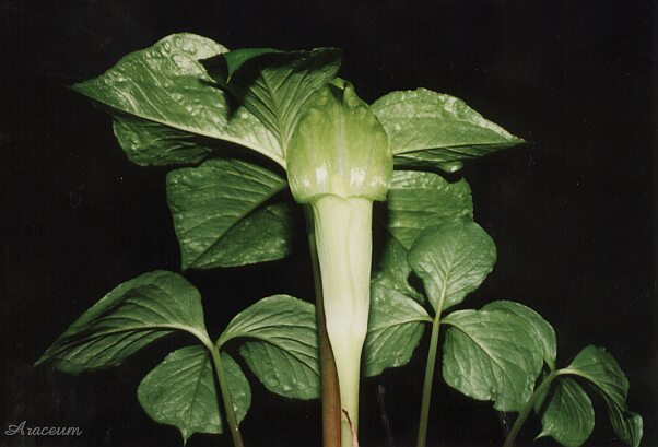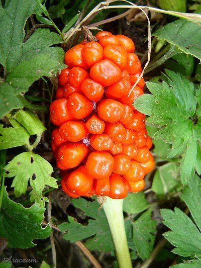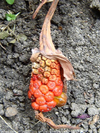 The tubers. | The inflorescence grows out of the gap in the petiole. |