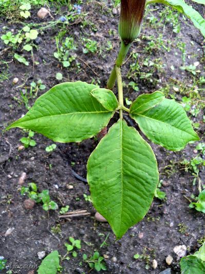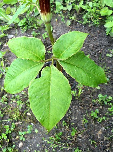 An adult plant produces 2 leaves from one tuber, each of them consists usually of 5 leaflets. |