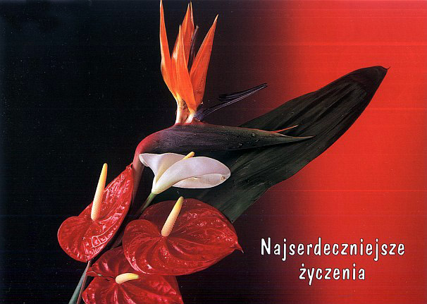 From Poland, a postcard with Anthurium andreanum and Zantedeschia aethiopica.The inscription means "Best Wishes from the Heart".