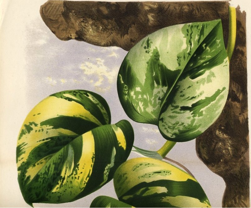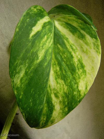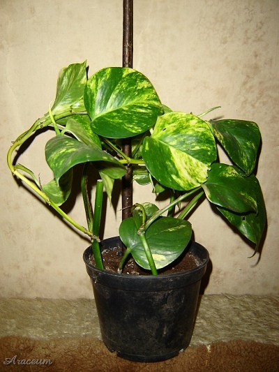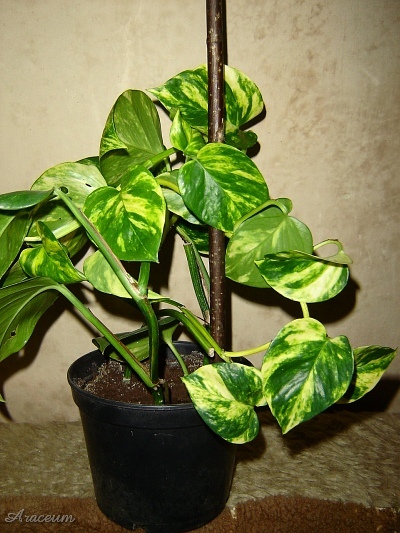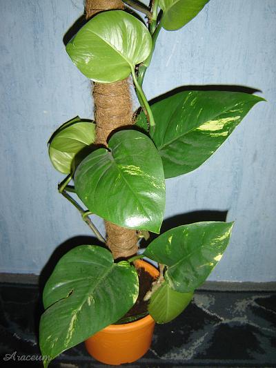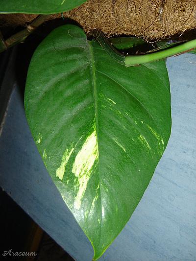 Botanicy powrócili do nazwy E. aureum ponieważ ten takson różni się od zielonolistnego E. pinnatum kształtem liści pośrednich między młodocianymi a dorosłymi i rzadszym kwitnieniem. Nie będę polemizował z naukowcami, jednak jestem nieco sceptyczny w odniesieniu do nazwy E. aureum jako oddzielnego gatunku, ponieważ widziałem wiele kultivarów innych rodzajów Araceae, jak Syngonium podophyllum, Spathiphyllum czy Zantedeschia. Normalnie Zantedeschia aethiopica nigdy nie ma plamek na liściach, jej odmiany hodowlane mają. Gatunek Syngonium podophyllum nigdy nie ma czerwono zabarwionych liści, jego kultivary mają. Czerwony barwnik występuje w kwiatostanach S. podophyllum i poprzez selektywną uprawę hodowcy sprawili, że rośliny wydobyły czerwony kolor również na liściach. Liście wielu odmian Syngonium podophyllum zachowują młodociany, strzałkowaty kształt, nawet gdy rośliny mają kilka lat. To samo mogło stać się z Epipremnum aureum. Jest on uprawiany i selekcjonowany przez więcej niż sto lat. Różnica w kształcie liści jest mało istotnym detalem porównując przykładowo z tym, co firmy ogrodnicze dokonały z Aglaonema, Caladium czy Dieffenbachia. Skrócono międzywęźla, ogonki, a blaszki liści mienią się wieloma kolorami. To samo mogli zrobić ze spontaniczną variegatą mutacją Epipremnum pinnatum, rzekomo znalezioną w stanie dzikim wieki temu na Wyspach Salomona i wysłaną do kolekcjonerów roślin oraz ogrodników. Przez lata mogli zmierzać, aby ta forma E. pinnatum stała się bardziej kompaktowa, o krótszych międzywęźlach i grubszych blaszkach liści, aby wyglądała atrakcyjniej dla przeciętnych miłośników roślin, nie botaników. Grubsze blaszki liści oznaczają, że rośliny są mniej wrażliwe na suche powietrze w mieszkaniach. Rzeczą oczywistą jest, że variegate formy kwitną rzadziej i słabiej niż ich jednobarwne formy wyjściowe. Jest to spowodowane częściowym brakiem chlorofilu. Dodam jeszcze, że istnieje pośrednia forma E. aureum o dłuższych, zielonych liściach bez wzoru.