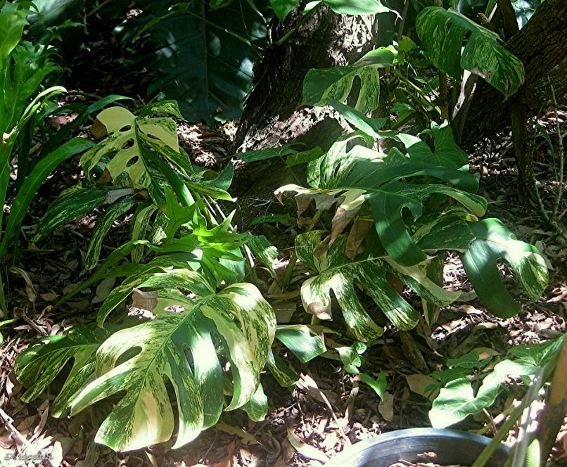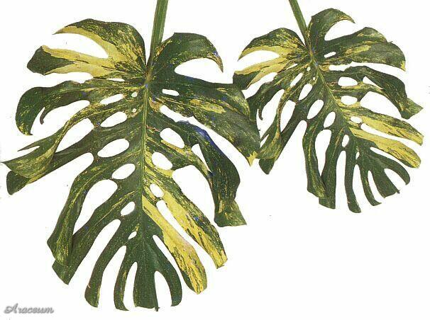One of two coloured cultivars of M. deliciosa.The yellow variegation is caused by partial lack of chlorophyll, in white variegated plants there lacks also caroten.