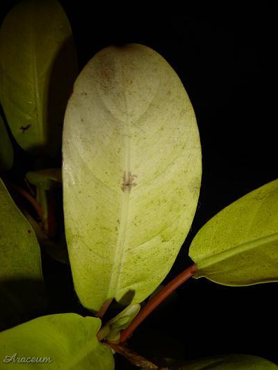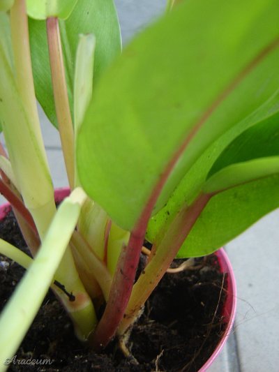Jego liście mają kolor fluorescencyjny żółty a ogonki są czerwone.