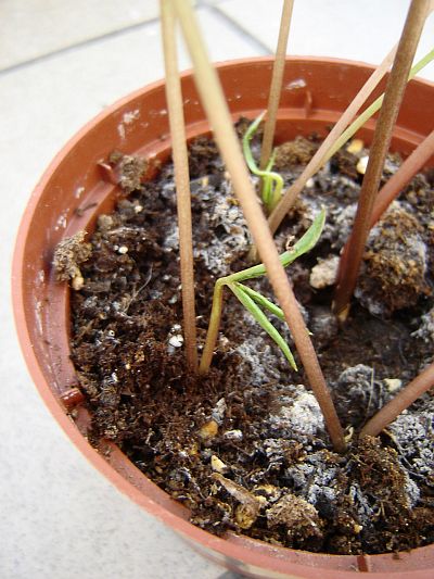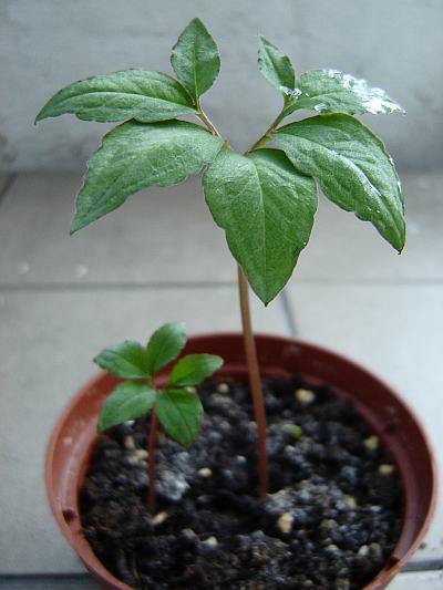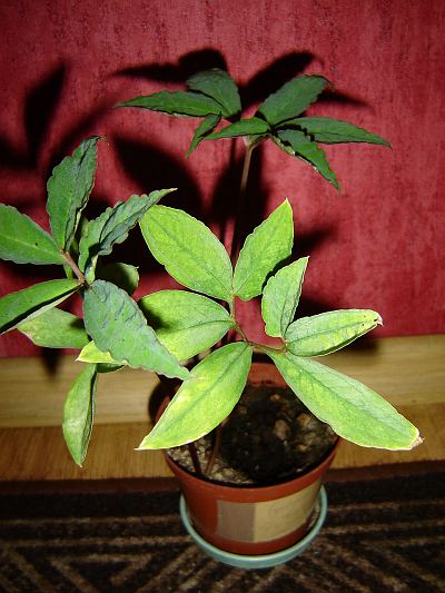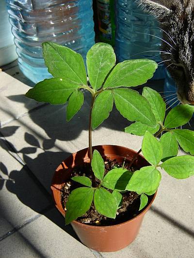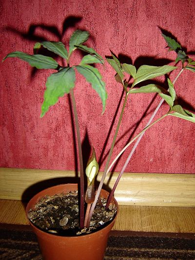 The largest plant was 26 cm tall with the leaf 11 cm of diameter. |  | | At the end of the season some tubers put up second leaves. | And the plant looked slightly chaotic. | |