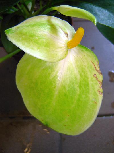 This is an Anthurium scherzerianum cultivar. It was photographed in 2006.