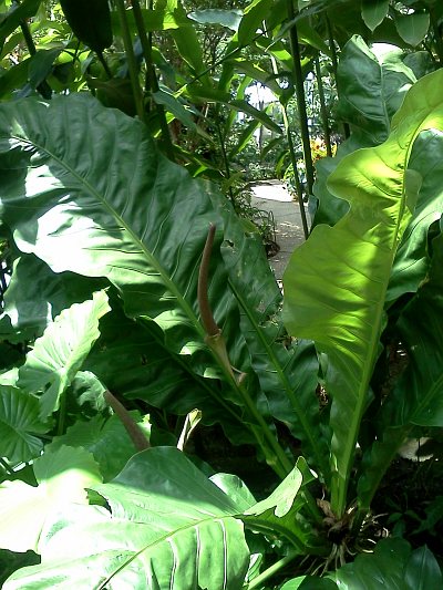 Its leaves reach about 4 feet (120 cm) tall and has purple spadix.