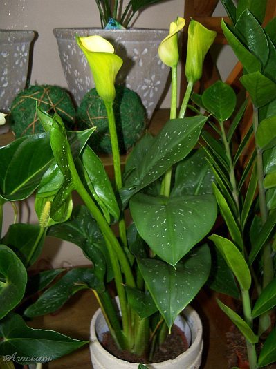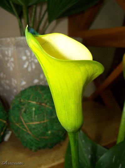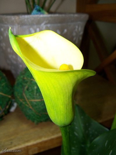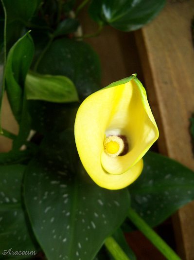 I saw it in a florist shop sold as a pot plant. The spathes are pure yellow (turning green with age).